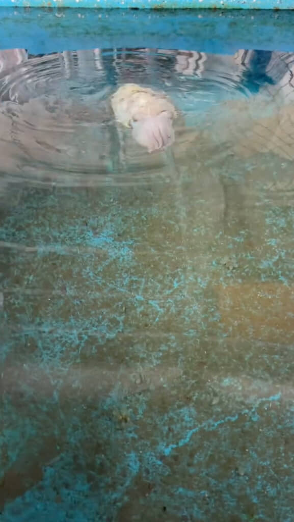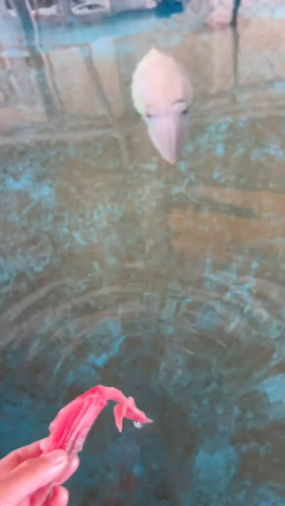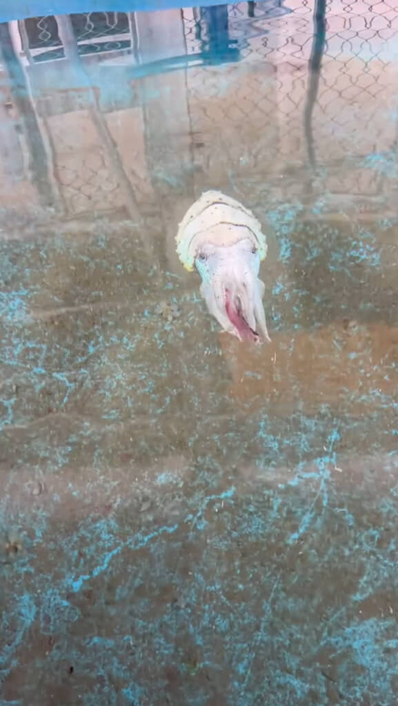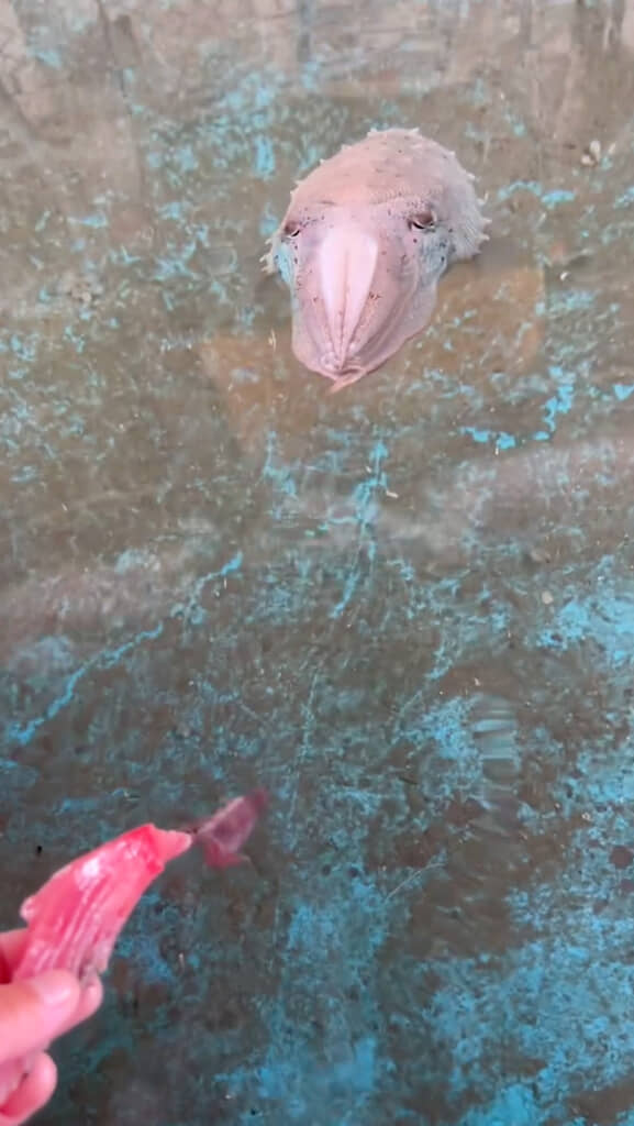 イカの中でもモンゴウイカは知能が高く、人に慣れやすい傾向があると言われています。こちらのイカさんもいしょしゃさんに慣れている様子。魚の切り身を水面にちょんちょんとつけてごはんの合図を送ると、スイーッと近づいてきました。