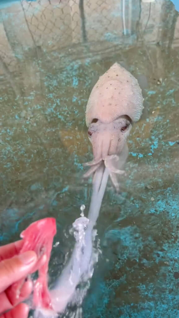 その後、イカさんは切り身をおいしそうにモグモグ。ペットのように手からエサをもらう姿はかわいいと感じますが、受け取り方は少々おっかないイカさんなのでした。
