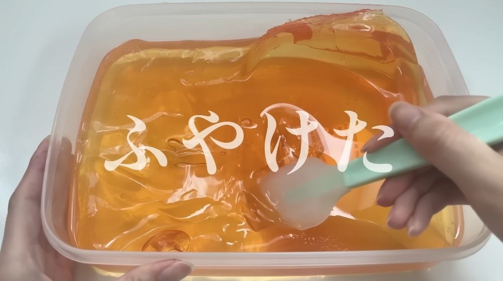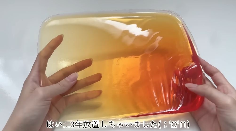 今回動画に登場したのは、3年半もの間放置されたオレンジ色のスライムです。時間の経過とともに完全に固まり、まるで琥珀(こはく)やべっこうあめのような見た目に変化していました。表面は滑らかで、触ると乾いたような音が鳴るほどカチコチな状態です。