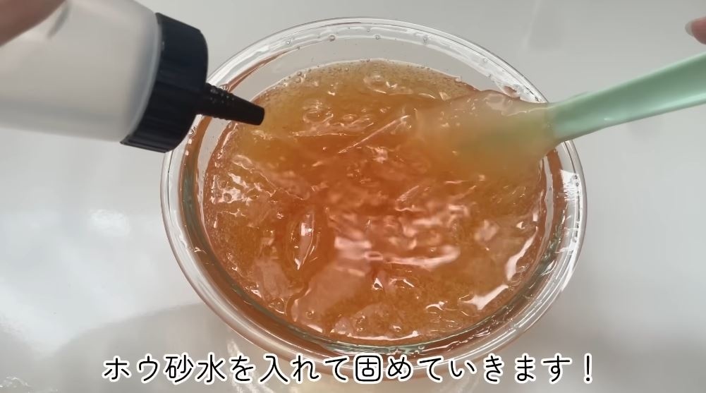 加熱後はしっかりと混ぜて、ようやく液状に。ここからは、スライムを復活させるため固めていきます。しおすさんは、ホウ砂10グラムを水100ミリに溶かした高濃度の“ホウ砂水”をスライムに加えながら、ひたすら混ぜていきました。
