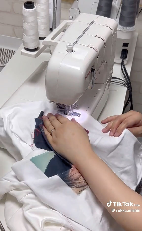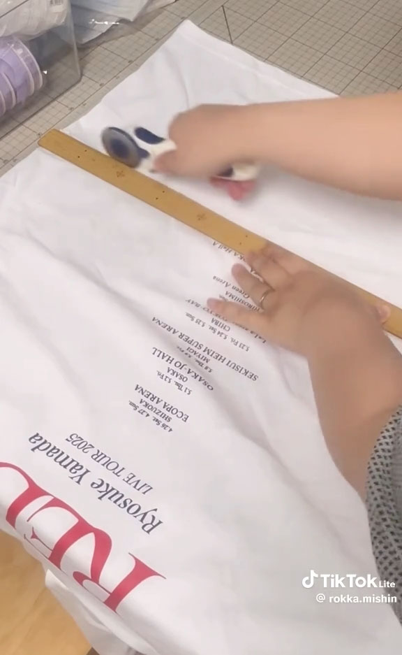 プリント部分を避けるように丁寧かつ素早く裾をカット