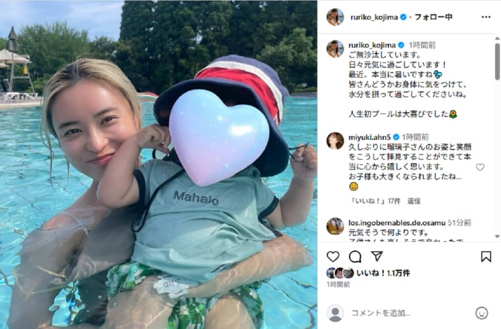小島瑠璃子、“29歳夫の急逝後初インスタ”で母子ショット披露 笑顔の金髪姿で抱え「人生初プールは大喜びでした」