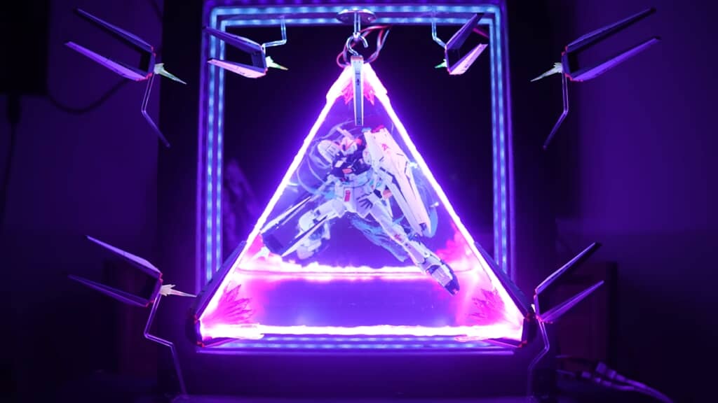 硬化を待っている間に、色を変更できるRGBライトと、蛍光塗料を光らせるUVライトを仕込んだ台座を制作。完全硬化まで3日待ち、レジンからアクリル板を剥がすと、透明な四角錐に浮かぶνガンダム本体が姿を現しました。完成が近づいてきた!