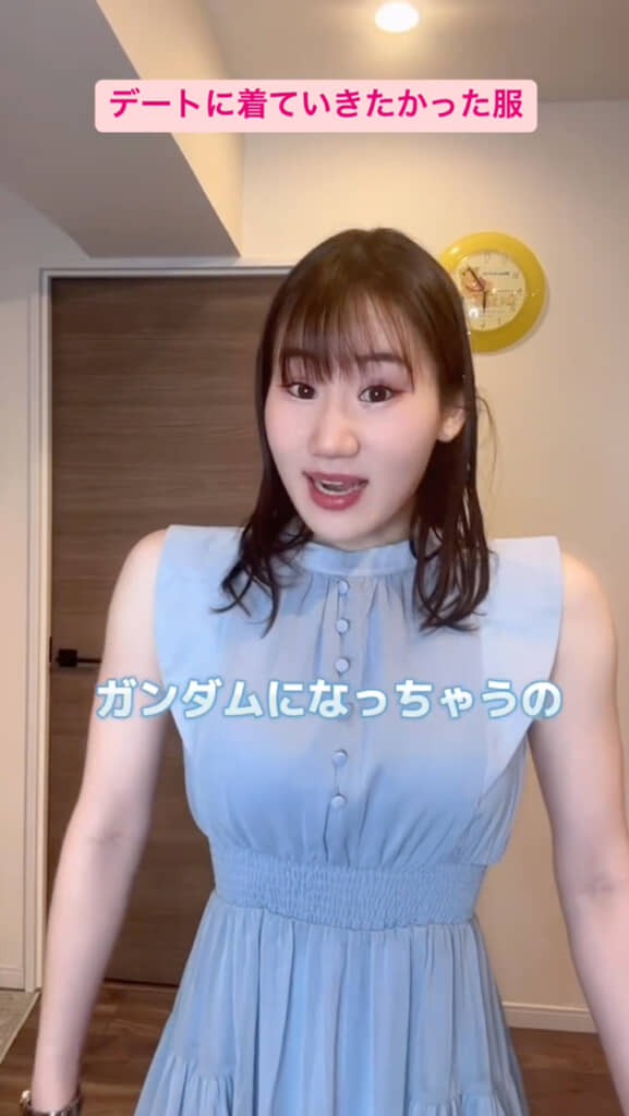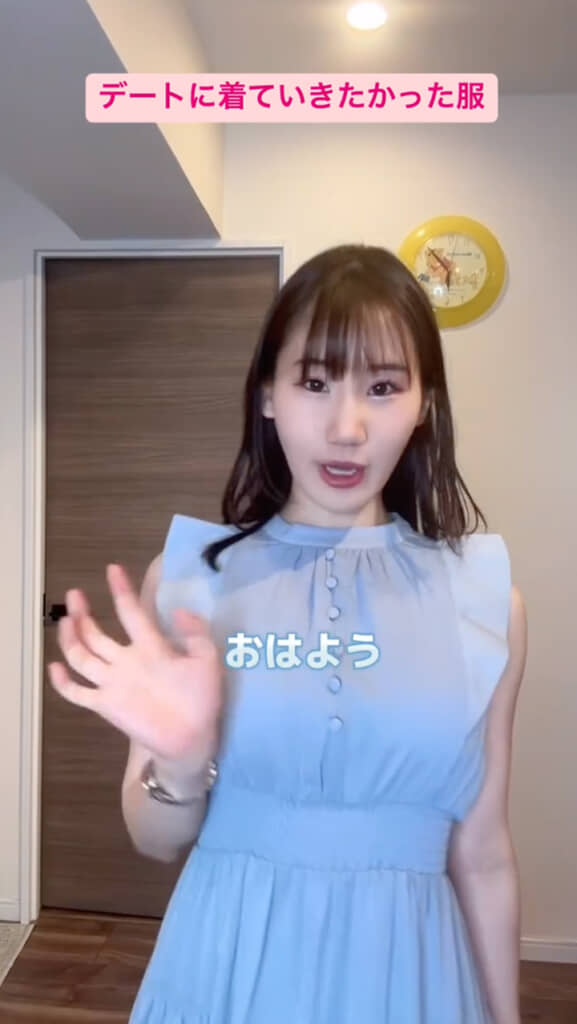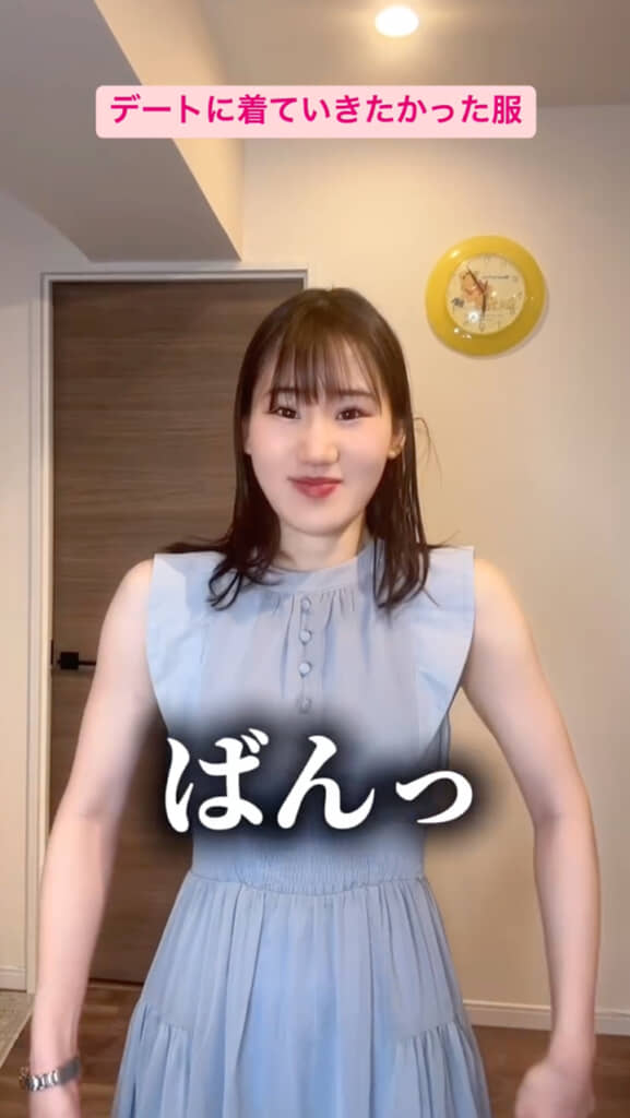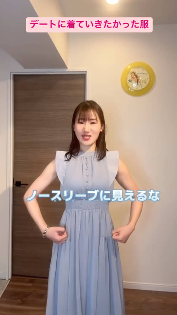 今回横山さんは、「GRL(グレイル)」で購入したという“デートに着ていきたかった服”を披露。袖にフリルがついた爽やかな水色の半袖ワンピースで、夏らしい涼しげでガーリーなデザインです。着用した横山さん、とても可憐でにあっている印象ですが……?