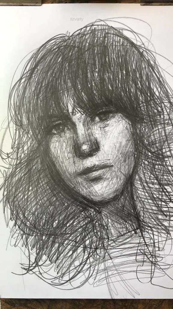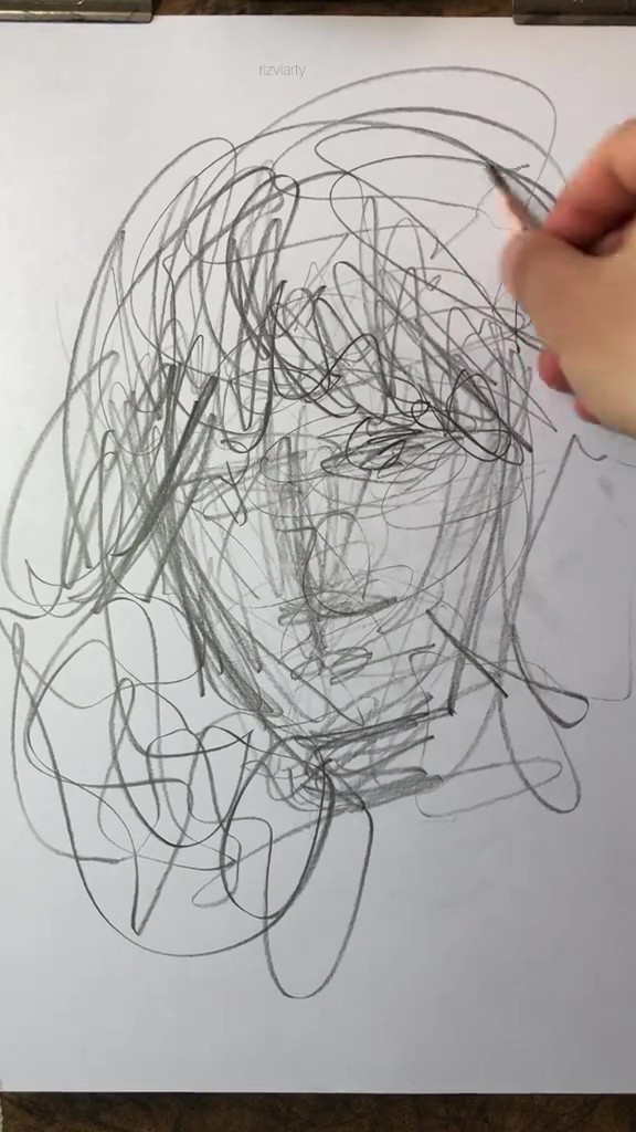 投稿主は、海外アーティストのRizviarty(@rizvi.arty)さん。鉛筆でざっくりとした丸い円を描き、その周囲にぐちゃぐちゃな線を描き足しています。指先でつまんだ鉛筆で軽快に線を引いており、落書きしているみたいだ……。