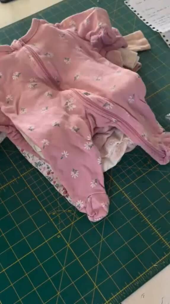 このベビー服は、できれば柄や色が合わせやすいものが数枚あるのが良さそう。これを、必要な形にカットして、パッチワークのように縫い合わせていきます。