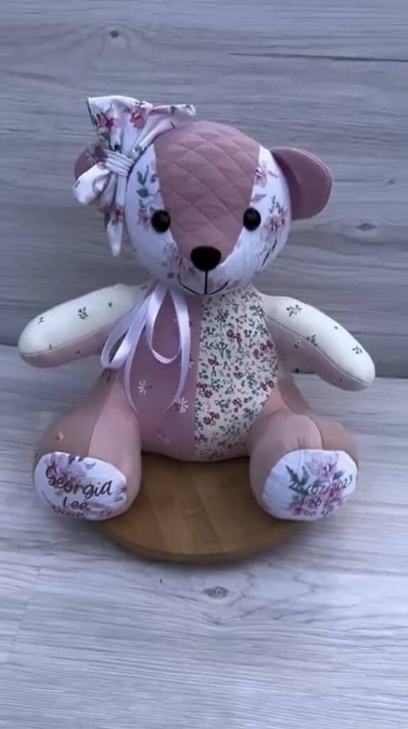 ちなみに、クマちゃんの足の裏には子どもの名前と、誕生した日にちと時間が刺繍してあります。わが子のために作られたたった1つのクマちゃん、ベビー服を生まれ変わらせるには最良の方法なのではないでしょうか。