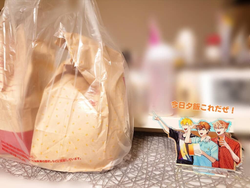 3人の男性キャラクターが並ぶアクリルスタンドには「今日夕飯これだぜ!」というメッセージが添えられ、その横にはテイクアウトした食べ物が入った袋が置かれていました。伝え方が天才的すぎませんか⁉