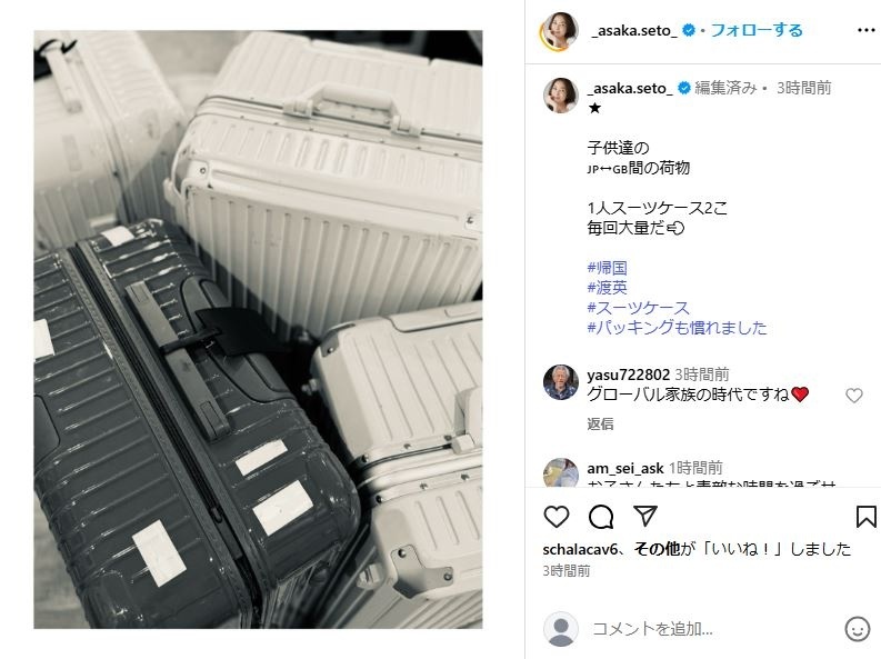 15歳の息子と11歳の娘が、ともにイギリスに留学中であることを明かしていた瀬戸さん。今回は夏休みということで、1人2つ分のスーツケースを持って一時帰国したことを明かしています。