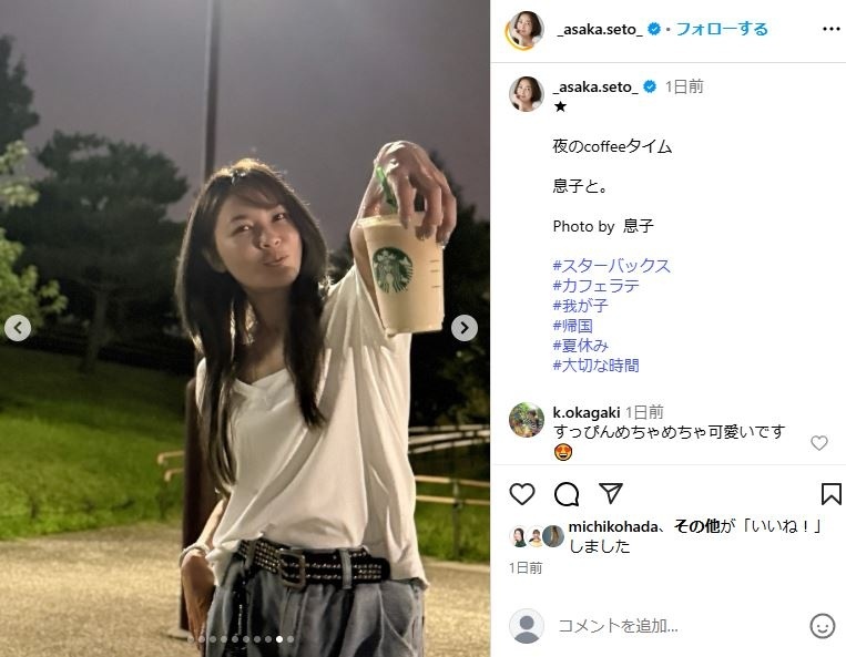 別の投稿では、夜にスターバックスでテイクアウトしたコーヒーを息子と楽しんだ様子も公開。息子が撮影したという写真の数々では、コーヒーカップを片手に息子へ向ける笑顔をのぞかせていました。
