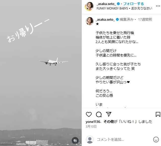 3月に帰国した際の投稿(画像は瀬戸朝香公式Instagramから)