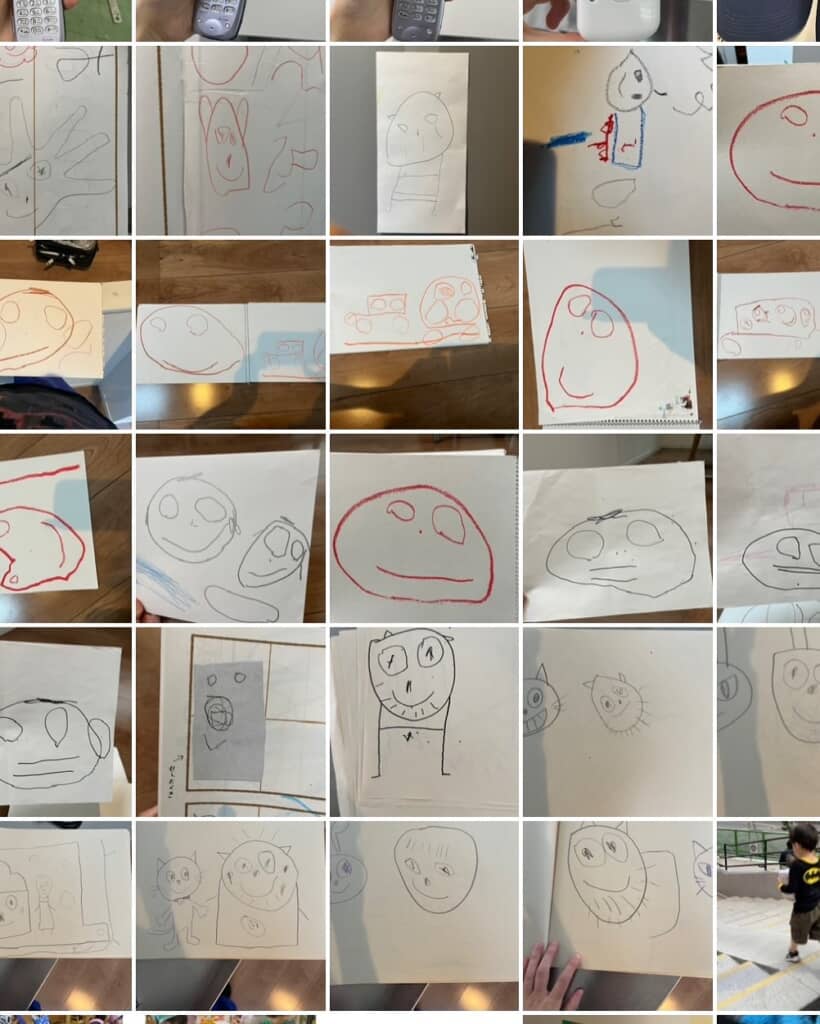 IZUMOさんは「ずっとやりたかった」とコメントしており、Instagramなどで制作過程の一部も公開。お子さんの絵1枚1枚をスマホで写真として記録し、パソコンに取り込んでから、それぞれにシンプルな色を追加してプリントしたようでした。