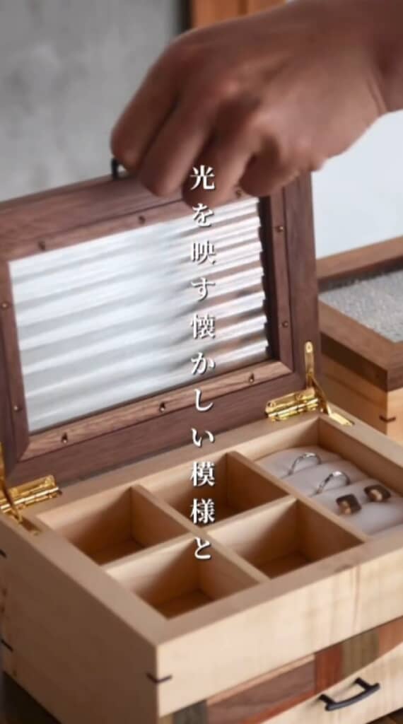 フジタマリさんは、使われなくなった型板ガラスに「再び光を当ててあげたい」という思いから、何かに活かせないかと考え、ジュエリーボックスを作り始めました。今回の動画では、ジュエリーボックスが完成するまでの工程を見せてくれています。