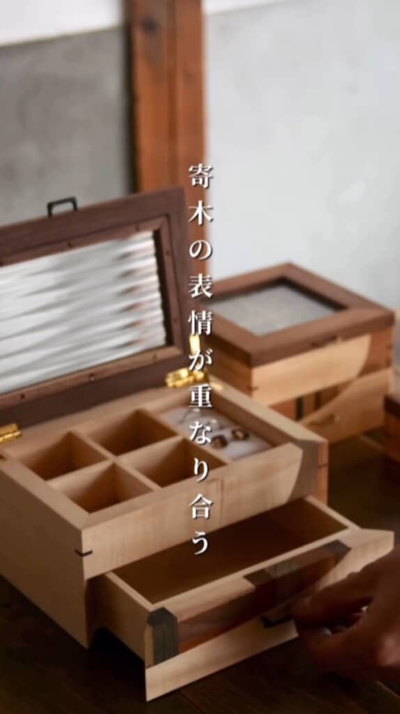 ジュエリーボックスは木製で、木目が美しい天然木をベースに、前面にさまざまな木片を組み合わせた寄木があしらわれています。カットした型板ガラスはガラス蓋として使用。懐かしさを感じる型板ガラスが独特な味わいをにじませています。