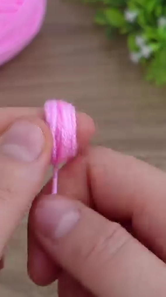 まずは輪の作り目を作る工程からスタート。ピンクの毛糸を人差し指にかけたら、10回くるくると巻きつけます。この工程が、仕上がりを変えるポイントのようです。