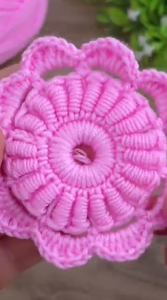 こうして最後まで編み込んでいくと、ぷっくりしたお花のモチーフが完成! 通常の編み方よりもかなりボリュームのある仕上がりです。見た目も手触りもよさそうで、とってもかわいいですね。