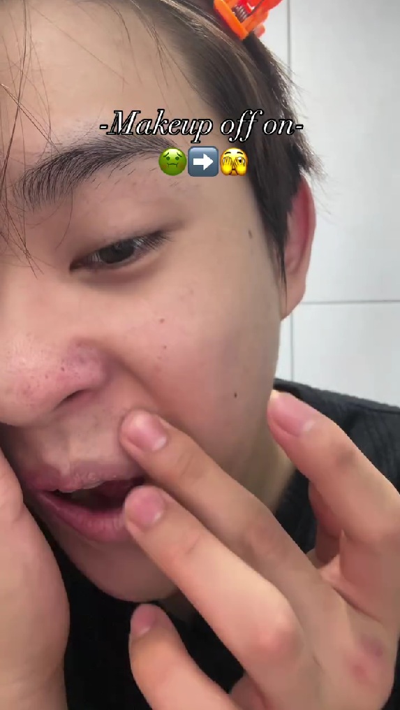 まずはジェヒョンさんのすっぴんバージョンを公開。眉は整っていて美しい一方、少しだけヒゲが残る口元や、いちご鼻がわずかに目立つ印象です。とはいえ、元々の顔立ちはクッキリしており「あともうひと手間でさらに化けそう」という雰囲気がありますね。
