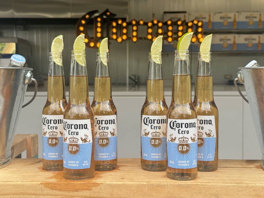 バースペースでは、定番の「コロナ エキストラ」や、ビールに合うフードも有料で販売しています。