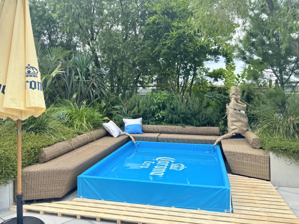 イベント会場には、涼しいミストが噴出するグリーンゲートや、冷たい水に足をひたして楽しめるフットバスプールなどが出現! 都会のど真ん中でありながら、まるでビーチに来たような開放感を味わえる非日常空間となっています。