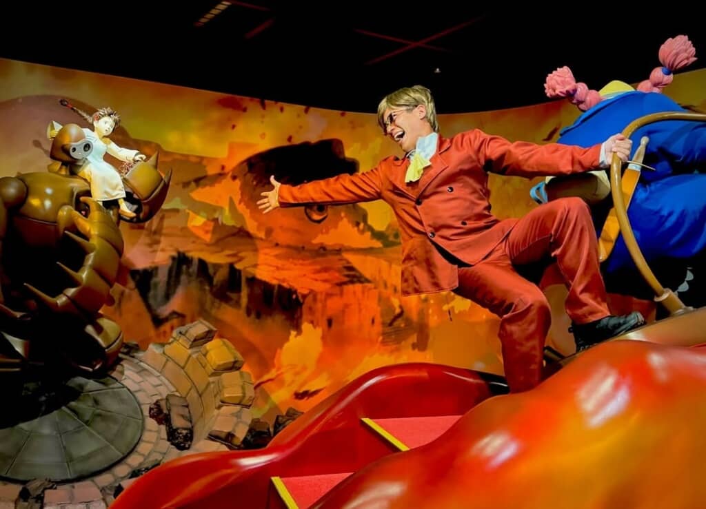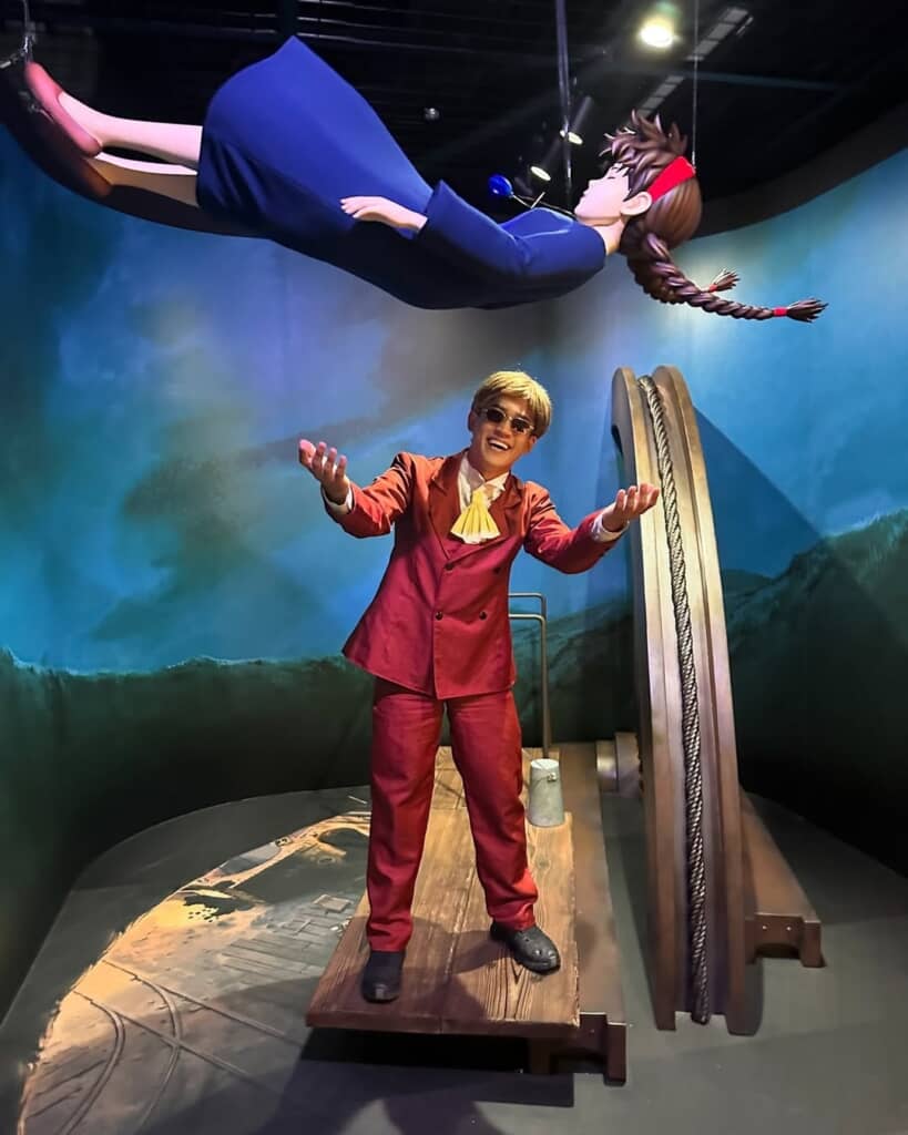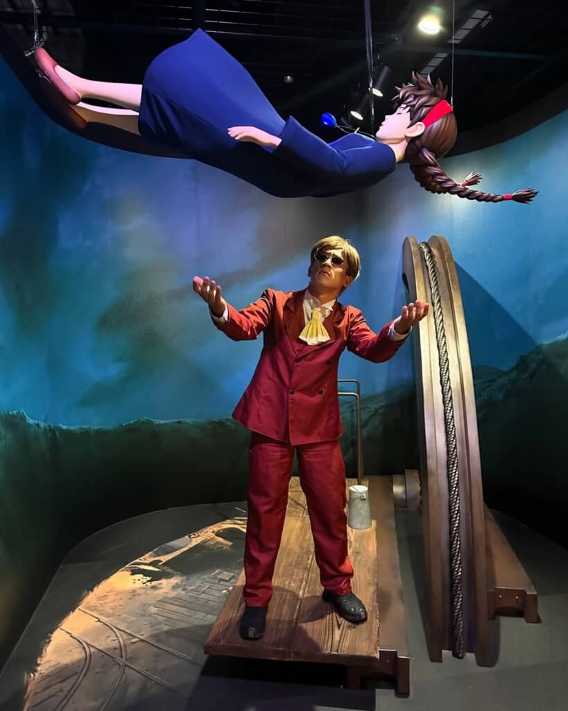 今回は愛知県長久手市にある「ジブリパーク」を訪問。パーク内にはスタジオジブリ作品の登場人物になりきって、名場面を再現できる体験型の展示があります。吉元さんはまず「天空の城ラピュタ」のコーナーに向かいました。ここでは空から落ちてきた少女シータと出会う“パズー”になりきれます。早速撮影された写真を見ると、サングラスをかけて赤茶色のスーツに身を包んだ男性の姿が。