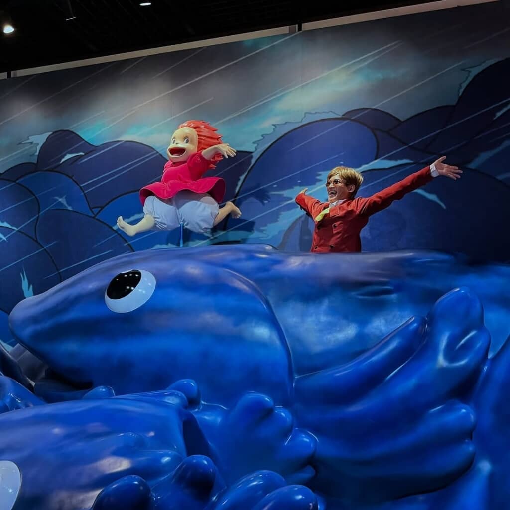 さらに「千と千尋の神隠し」のコーナーでは電車の座席に座ってカオナシと仲良し2ショット。「崖の上のポニョ」のコーナーでは、荒れ狂う海でポニョと一緒に走り回っています。楽しそうですね。