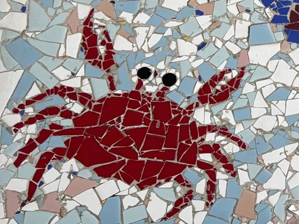 MTさんが投稿したのは、タイルを貼り合わせて作った作品です。その中央部には赤いカニの姿があり、「このカニは私が作った」とコメント。この作品が飾られている真下にはゲタ箱があるそうで、毎日利用している息子さんからある日「タラバじゃないよね?」「形と足の数があってない気がしたから」と聞かれたそうです。