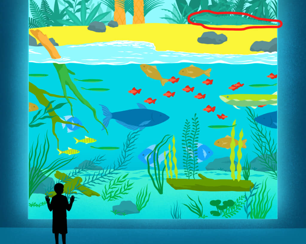 「ワニ」は画面右上の茂みの前に隠れていました! 見つかったかな?