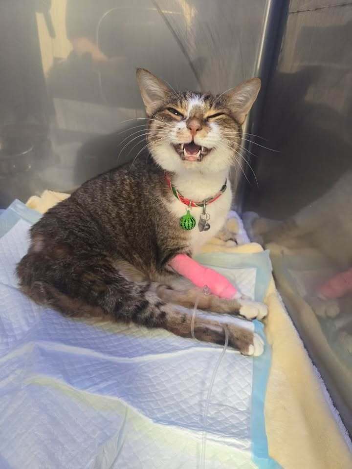 飼い主さんは2023年2月24日の朝、ひき逃げされた愛ちゃんを発見し、動物病院に緊急搬送しました。愛ちゃんは腹壁ヘルニア、内蔵の飛び出し、膀胱の反転、軟部組織の壊死(えし)、足の骨折などに見舞われて命が危ぶまれる状態でしたが、一命をとりとめました