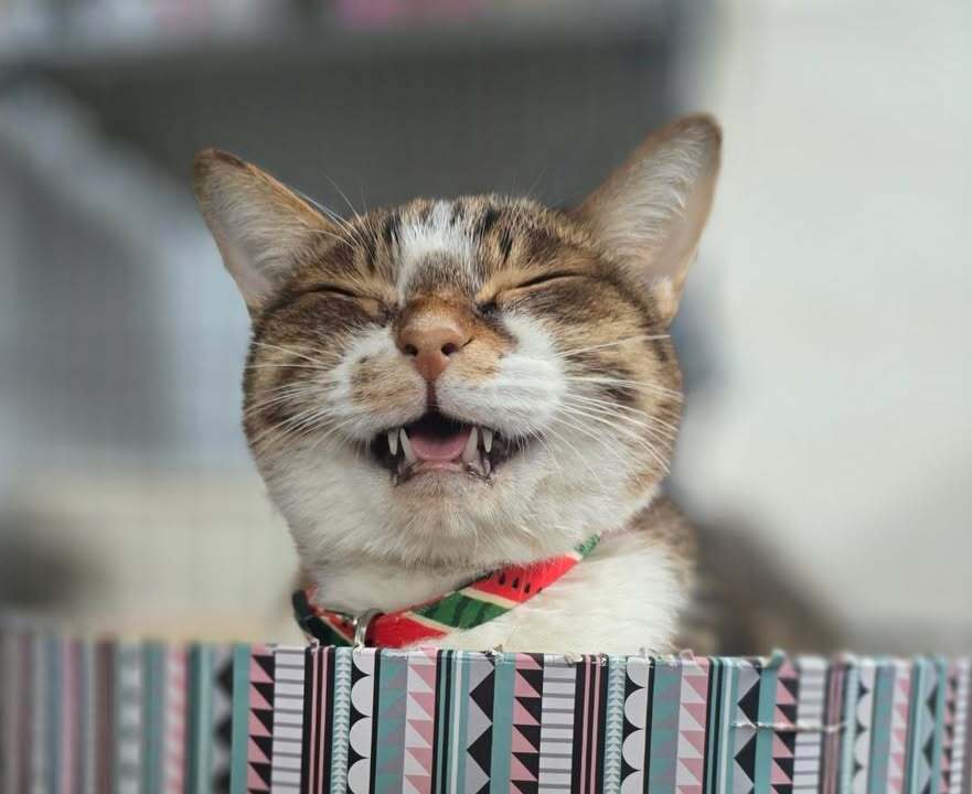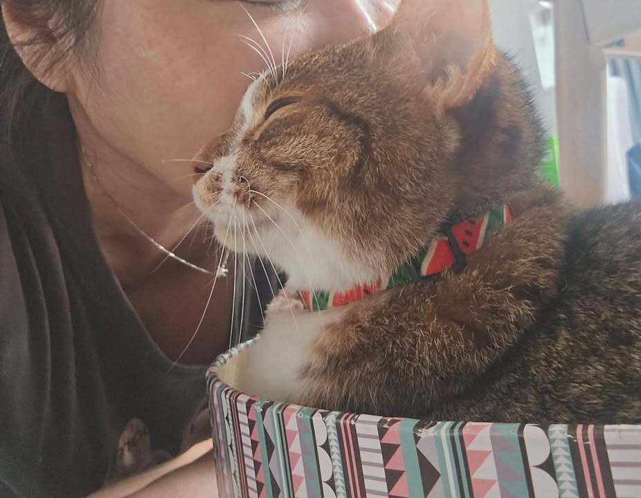ある日の愛ちゃんは、飼い主さんが捨てようと思っていた箱の中にイン。猫ちゃんらしい行動と、まん丸なオメメがかわいいです。夏には季節にぴったりなスイカの首輪を付けてもらいました。赤と緑の縞々が白い毛並みにお似合いで、こころなしか誇らしげにも見えます。楽しいことも、いっぱいだったね。