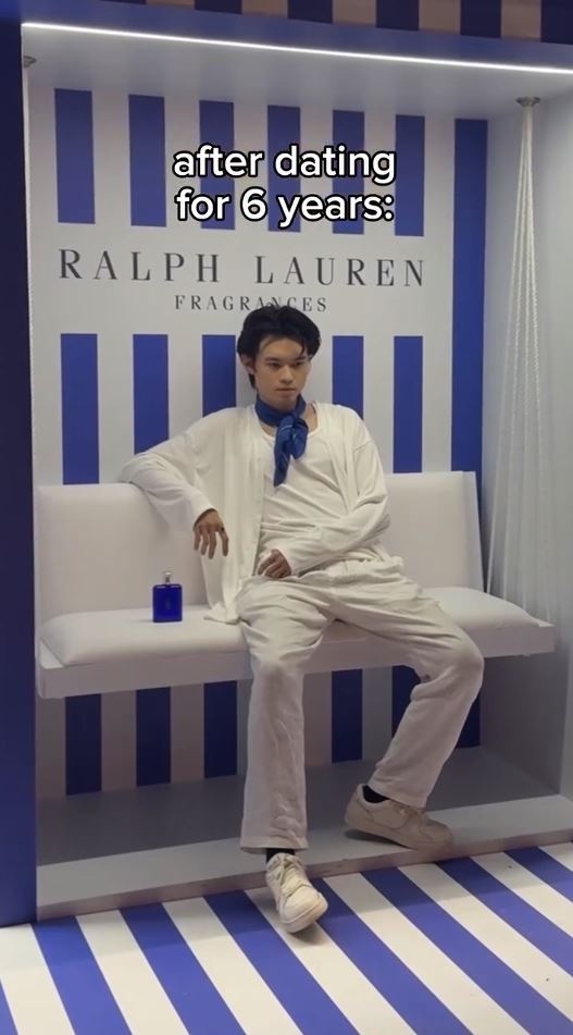 しかし、交際して6年がたつと……ラルフローレンのホワイト系のカジュアルスーツを着こなすモデル系に! 普段のカジュアルルックも流行を取り入れ、大きめレンズの黒縁メガネにオーバーサイズのデニム&ニュアンスカラーのフーディーを合わせています。