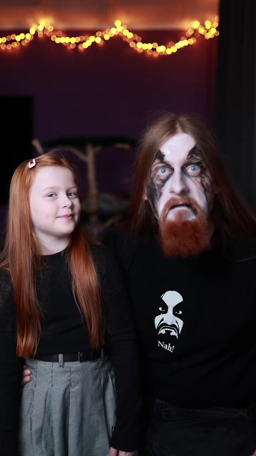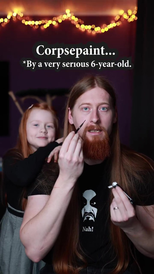 今回は、メタルバンドのミュージシャンを死者や悪魔のように見せる独特なメイク「コープス・ペイント」を施す様子を披露……しようとしたところ、6歳の娘さんにメイク用のペンを奪われてしまいます。不敵な笑みを浮かべる娘さんを見て、パパはもうされるがままに身を任せるほかありません。