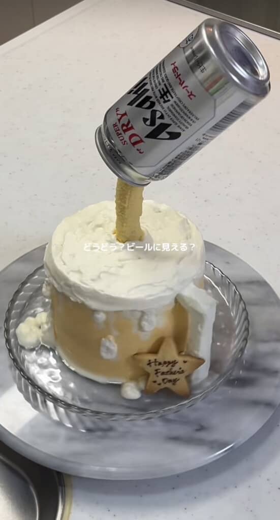 こうして出来上がったのは、まるでジョッキにビールを注いでいるように見える立体的なデザインのケーキ! ビールの空き缶を使って、ジョッキになみなみと注ぐ様子を表現しています。缶は「く」の字に曲げたストローを使って固定しているそうで、細部までこだわって作られていることが分かります。
