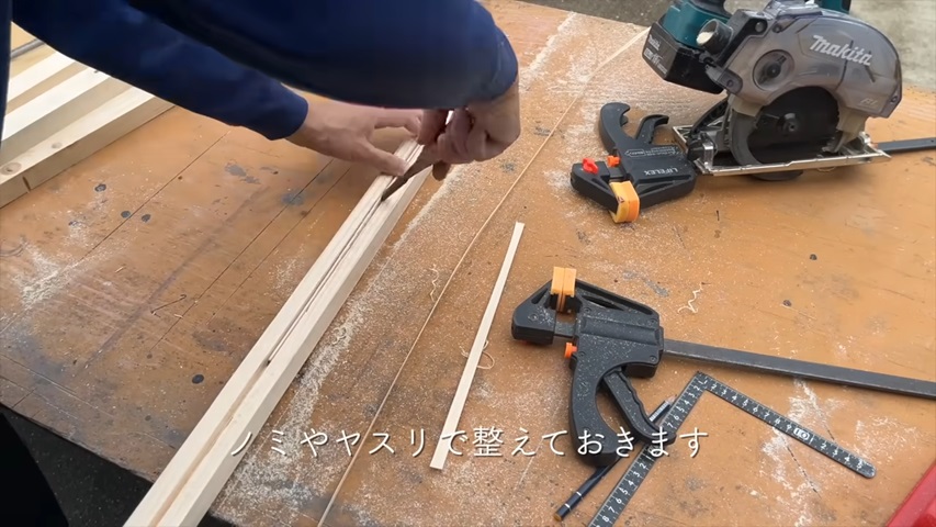 戸車のカバーを取り付けたら、次に外枠に取り付けた木材の調整です。枠内の木が反っている影響で木の間隔が若干ずれているのを整えていきます。