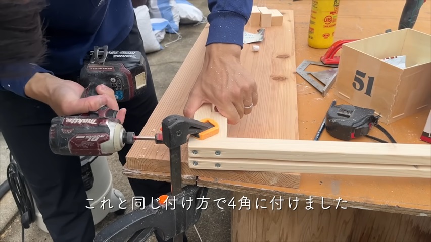 次に柵の外枠を組んでいきます。後工程を踏まえて、まずはいったんビスで仮止め。サンドペーパーで表面を整えつつ外枠が出来上がったら、四つ角に角材を付けていきます。これは柵の補強とスライドを補助する戸車を設置するためとのことです。