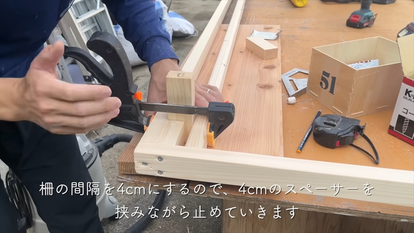 外枠が出来上がったら、枠の中の木をボンドとビスで付けていきます。今回は柵の間隔を4センチにするとのことで、スペーサーで距離をきちんと取りながら作業を進めます。なお、柵の間隔は飼っているワンちゃんやネコちゃんの体型などを踏まえて変えたほうが良いとのことです(子猫を飼っている人は3センチくらいがオススメとのこと)。