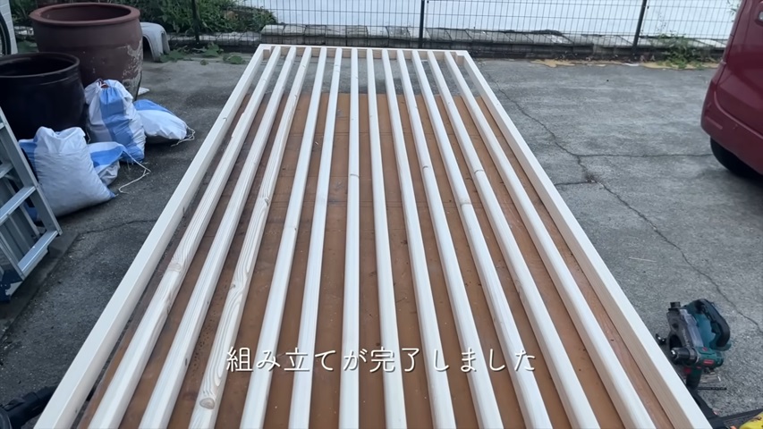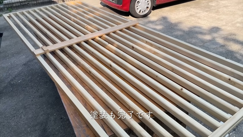 まず用意するのは、ホームセンターで購入した27×40×2700ミリのホワイトウッド木材15本。ここから横用の木を2本、縦用の木を14本切り出します。横用の木は920ミリ、縦用の木は2300ミリで、それぞれカットします。