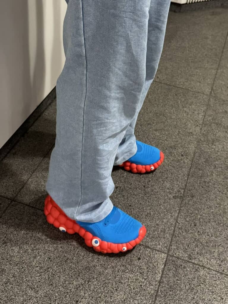 シンプルな上下コーデは全くカスタマイズしていない初期アバターの服装のように見えます。しかし、それ故にミャクミャクスニーカーの存在感が際立っており、友人の言葉がまさに当てはまる姿なのでした。