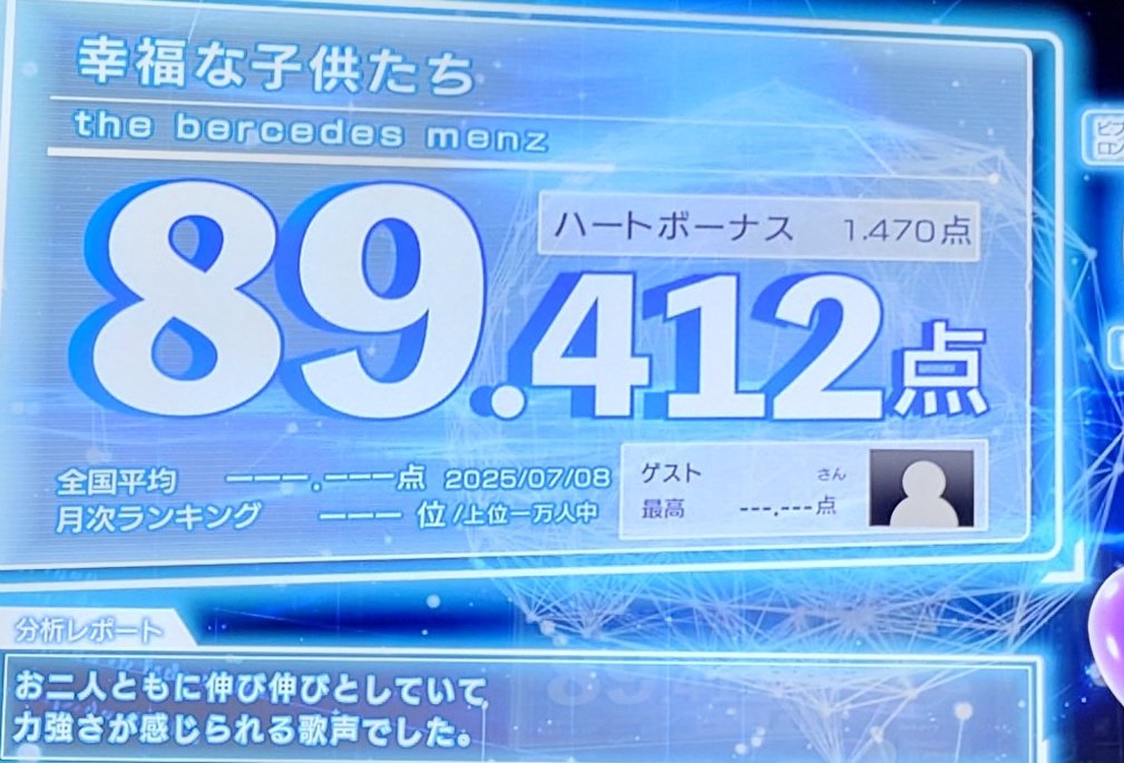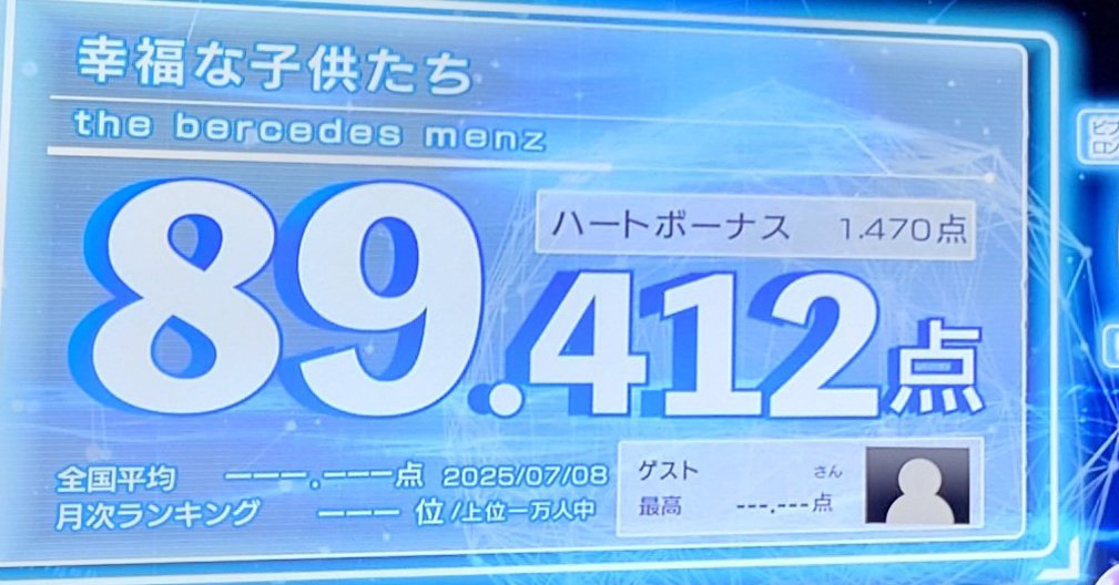 大好きなバンド・the bercedes menzの楽曲「幸福な子供たち」を歌い、採点結果を見てみると……89.412点の表示。まずまずの高得点で、どこにもホラーな様子はなさそうですが……。