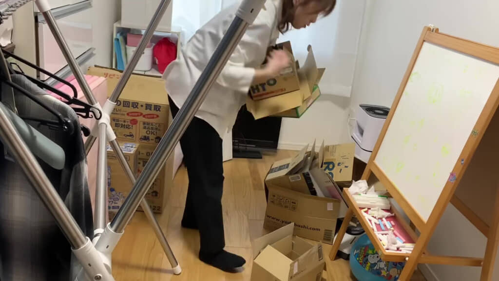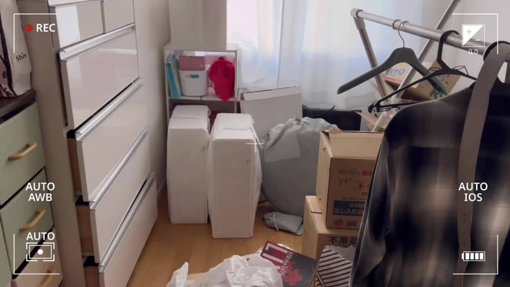 次は物置のようになっている”ラスボス部屋”をチェック。ペットボトル飲料や洋服、使わなくなったパソコンなど、さまざまなアイテムが無造作に置かれています。将来的には子ども部屋にするそうですが……。