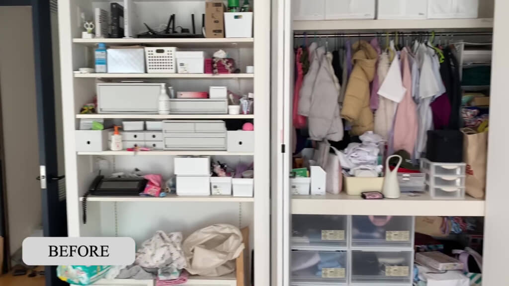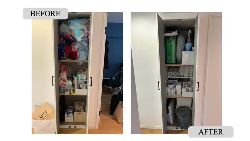 廊下の細長いクローゼットを開けると、そこには物がたくさん詰め込まれていて今にも溢れ出しそうです。細かく見ていくと、上段に子どもが作った工作物といった思い出の品がビニール袋にぎっしり。長女が幼稚園に通っていた約5年前から、少しずつ増えてしまっているそうです。中段や下段にはトイレのお掃除グッズやティッシュ類などを収納していました。