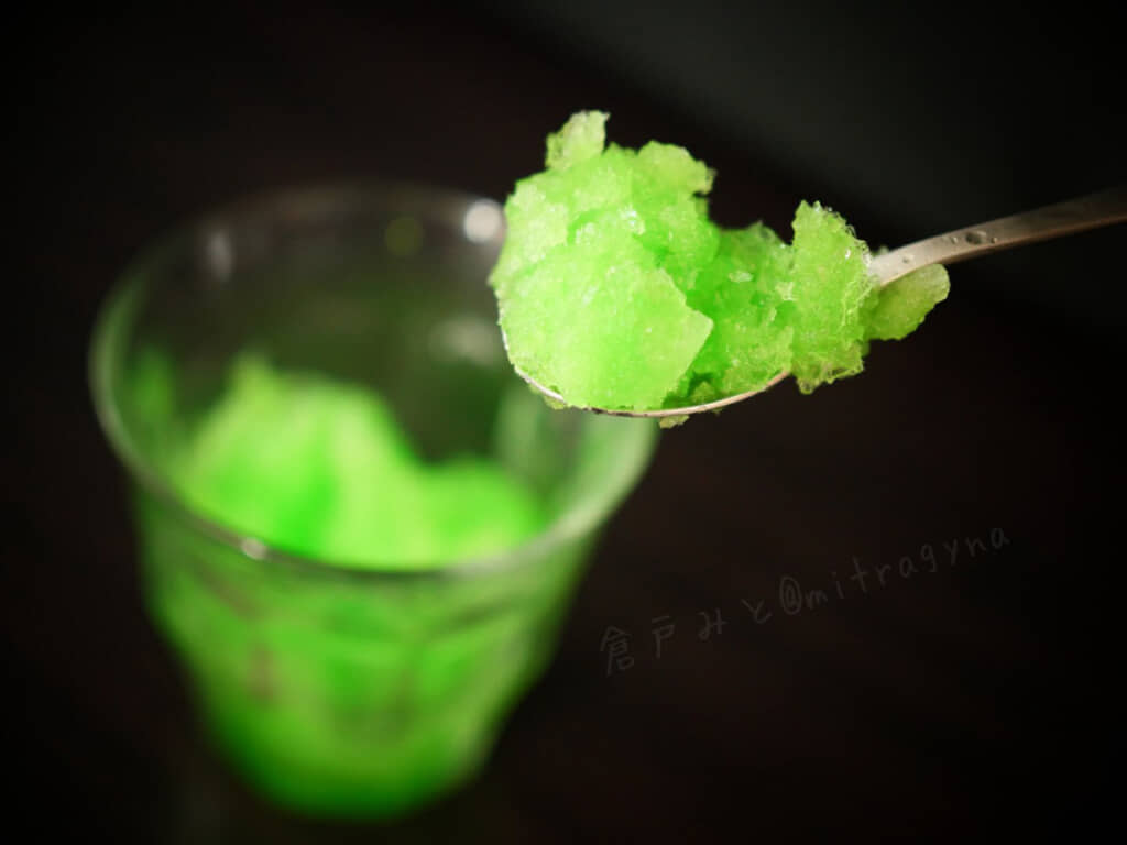 投稿主は、倉戸みと(@mitragyna)さん。かき氷シロップを水で薄めて凍らせるというレシピを紹介しています。シロップがよくしみた、“かき氷のいちばん美味しいところ”が、簡単に作れるようです。