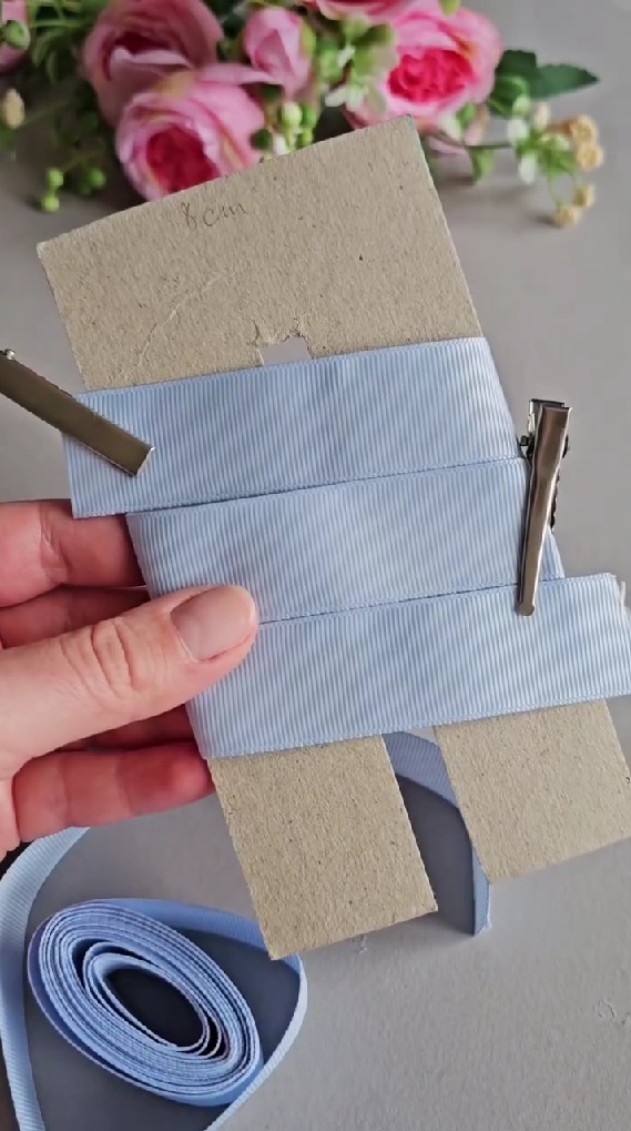 まずはコの字の厚紙にリボンをくるくると3本線になるように巻き付けていきます。使うリボンはお好みの柄や幅でOK。動画では、水色のグログランリボンを使用しています。