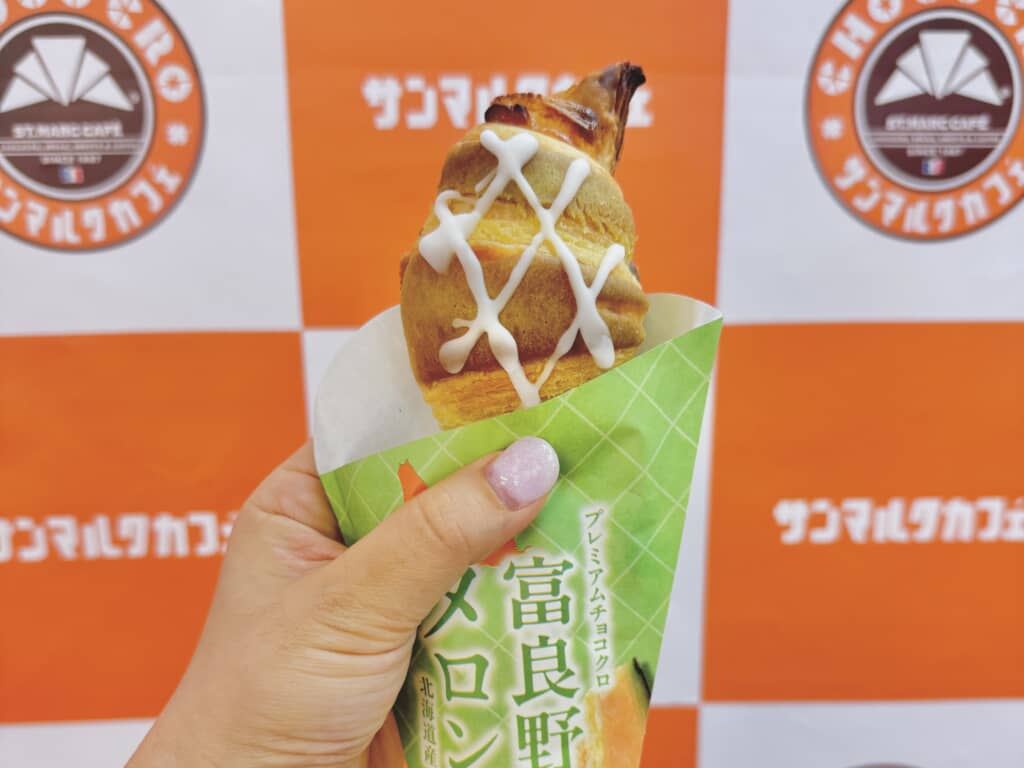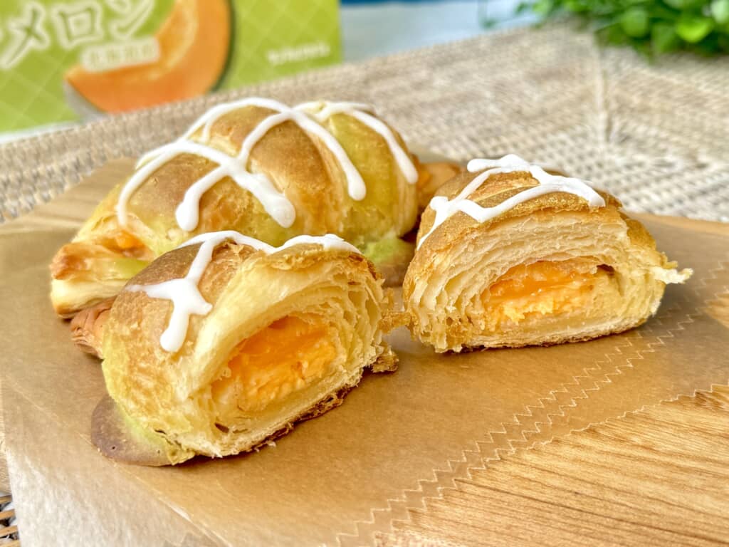 クロワッサン生地の中には、華やかなオレンジ色のメロン風味ホワイトチョコレートと、富良野メロンピューレを使用したとろっと食感のミルクメロンクリームが入っています。サクサクのクロワッサン生地と、もっちり濃厚なメロン風味チョコレート、これは相性抜群の組み合わせ……!
