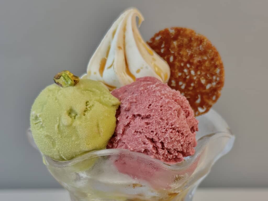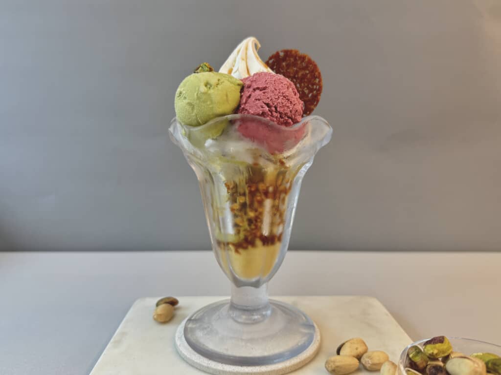 濃厚な風味のピスタチオアイスと甘酸っぱいカシスムースは、食感も風味も全く異なり、ひと口ごとに違った味わいを楽しめます。ザクザク食感のグラノーラ、りんご果肉入りソース、サンマルクカフェオリジナルの塩キャラメルソースといったトッピングが絡み合い、複雑でリッチな“オトナのデザート”を体験できます。