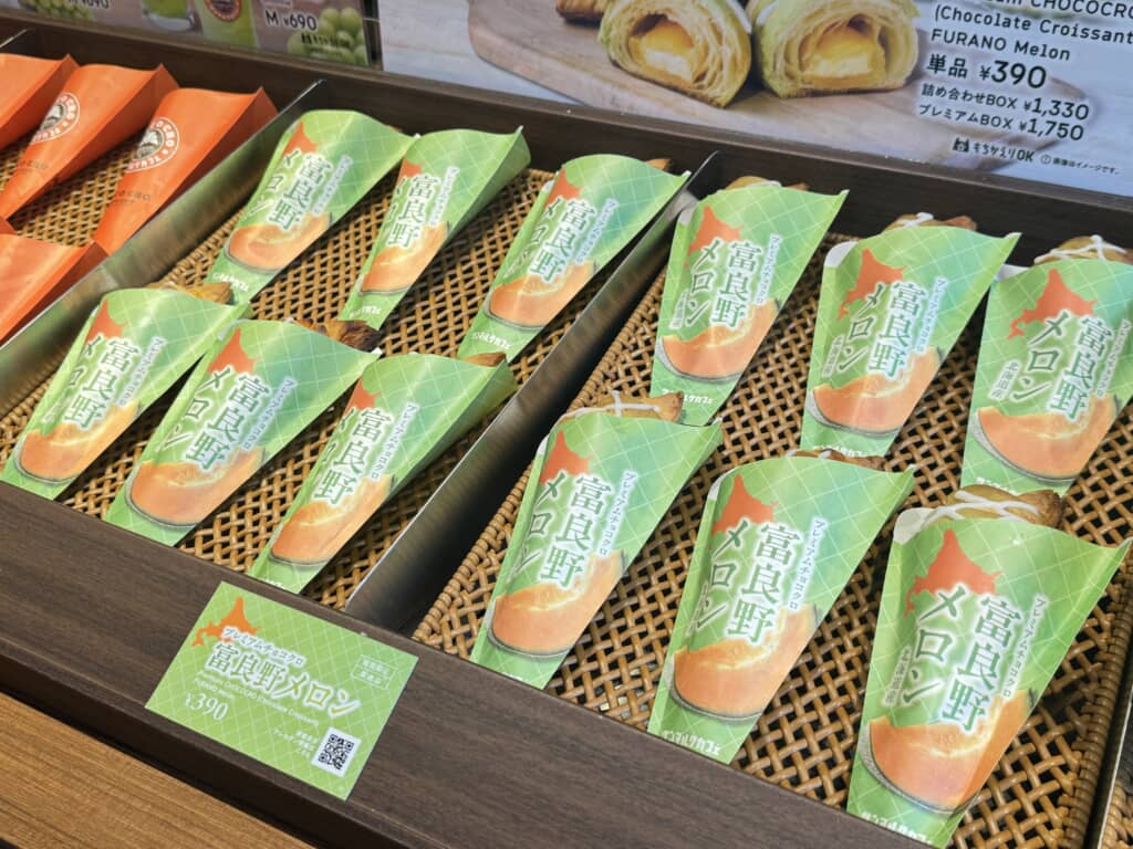 「プレミアムチョコクロ 富良野メロン」(1個390円、プレミアムBOX5個入りは1750円)は、富良野メロンピューレ入りのフィリングを載せて焼き上げたクロワッサンの上に、格子状の模様をアイシングデコレーションしています。メロンパンのようなビジュアルがとってもキュート!