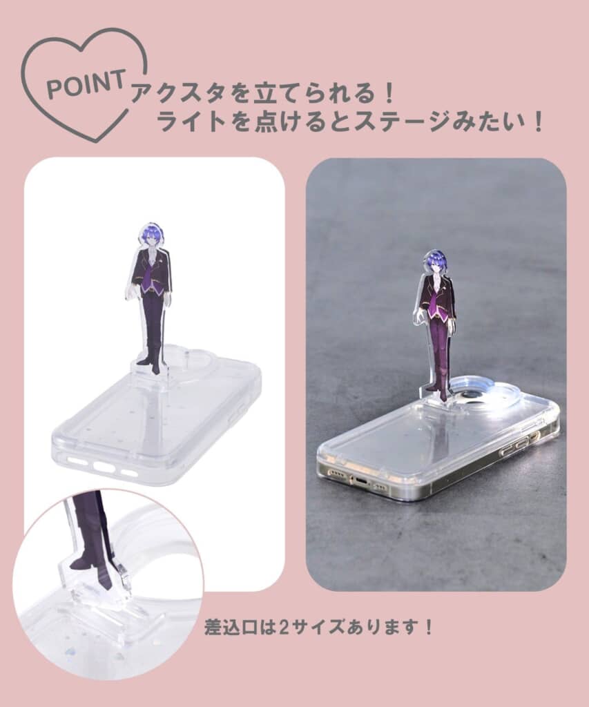 この商品の最大の特徴は、ケースの内側にアクリルスタンドを入れてディスプレイできること。ケース外側のカバーをスライドさせれば、簡単にアクリルスタンドを出し入れすることができます。“推し”の姿を肌身離さず持ち歩くことができ、汚れたり折れたりする心配が少ないのもうれしいポイントです。