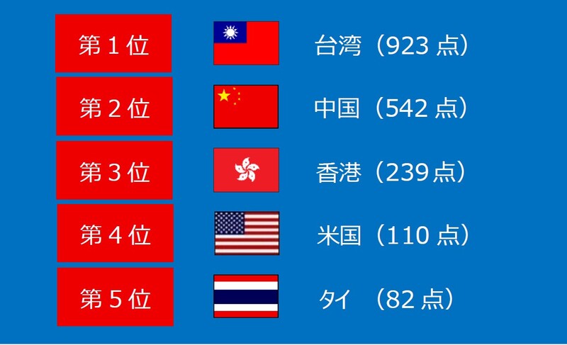 また、エディオンなんば本店からは、万博オフィシャルショップの国・地域別販売数ランキングも公開されています。6月の免税データに基づく国・地域別販売数ランキングでは、1位が台湾(923点)、2位が中国(542点)、3位が香港(239点)、4位が米国(110点)、5位がタイ(82点)と、アジア圏を中心に人気を集めていることがわかります。