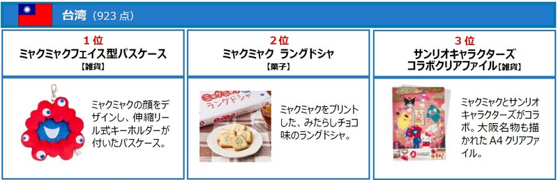 各国・地域の売れ筋を見ると、台湾では「ミャクミャクフェイス型パスケース」が最も人気で、続いて「ミャクミャク ラングドシャ」「サンリオキャラクターズコラボクリアファイル」が好評とのこと。中国では「ミャクミャク 大阪城マグネット」(1位)や「ミャクミャク×大阪環状線缶バッジ」(3位)、香港では「ミャクミャク大阪きんちゃく袋」(2位)や「公式スタンプパスポート」(3位)がランクインしています。米国人客には「平竹(大)うちわ」や「ミャクミャク サブレ」、タイでは「ひこにゃん・わるにゃん将軍コラボキーホルダー」や「ミャクミャク 総柄ステテコ」が選ばれており、各国・地域ごとの文化的嗜好の違いも垣間見えます。