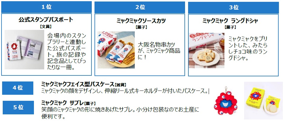 第2位は「ミャクミャクソースカツ」(648円)。大阪名物の串カツをイメージした定番の駄菓子が、ミャクミャク仕様のパッケージになっています。続く第3位は「ミャクミャク ラングドシャ」(864円)。ミャクミャクをプリントした、みたらしチョコ味のラングドシャです。お土産として配りやすそうなお菓子がランクインしています。