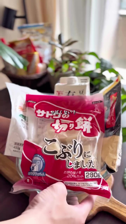 まず、切り餅3個(約120グラム)を一口サイズにカット。ボウルに入れ、そこに豆乳70ミリリットルを注ぎます。